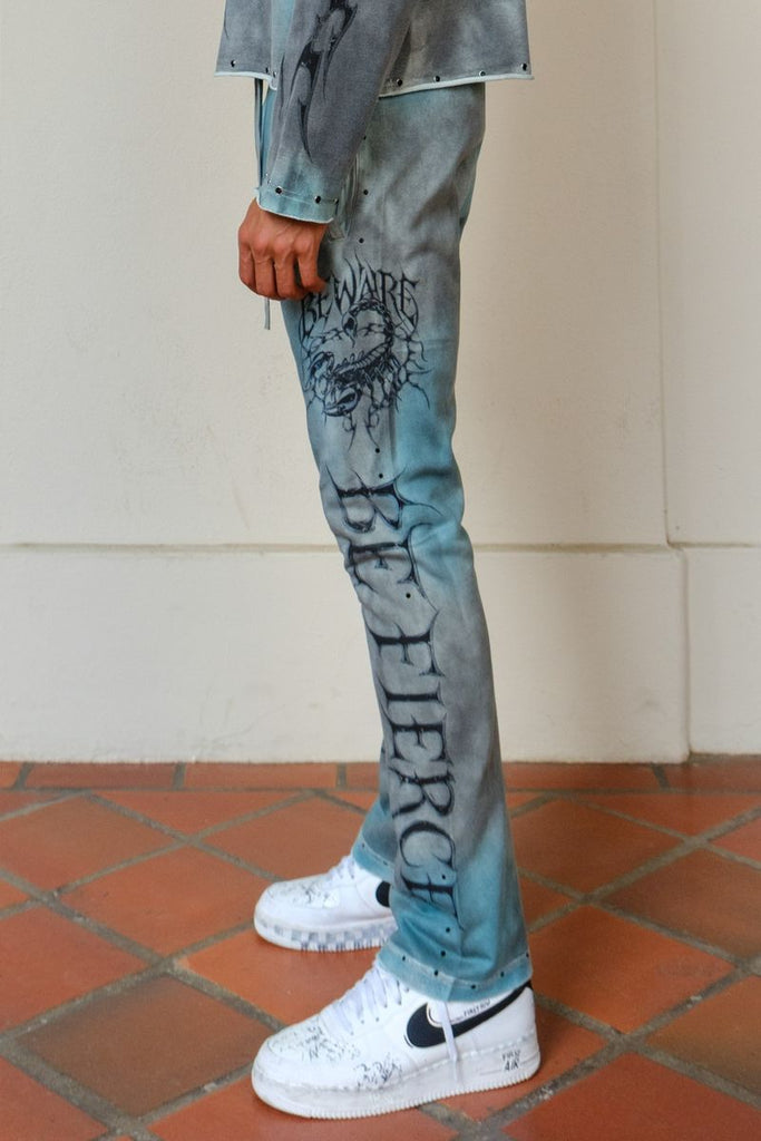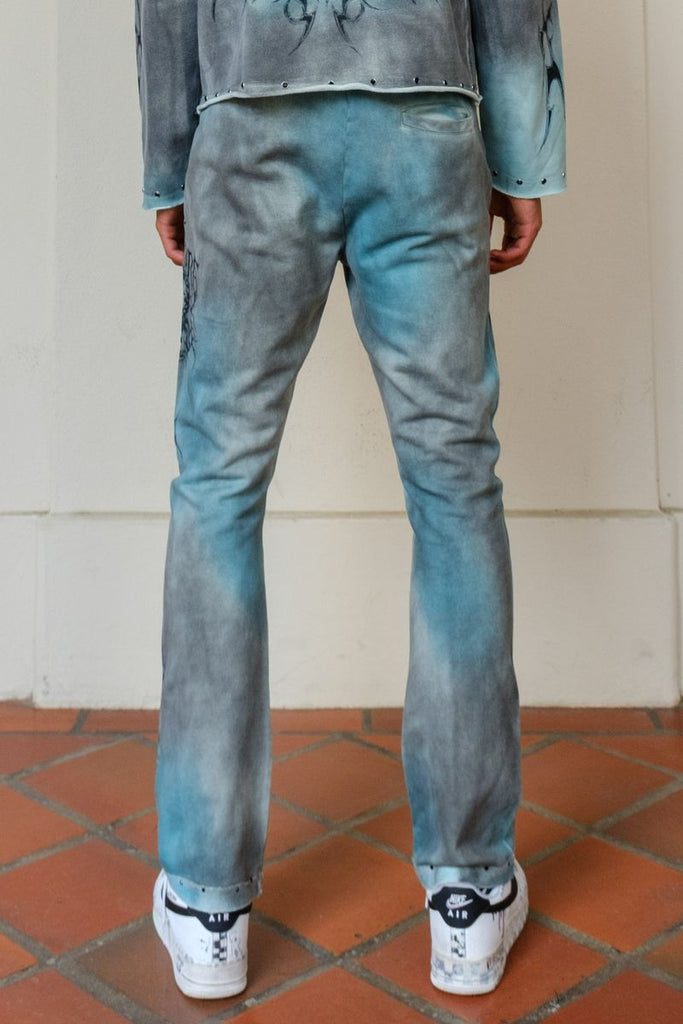 A pair of washed stack jogger featuring stone & H-spray detail, elastic waist with draw cord, welt pockets and back pocket.