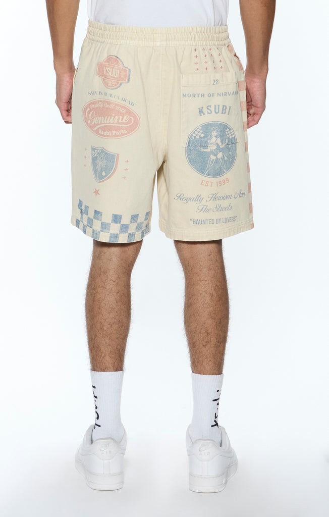 Regular fit elastic waist short with drawstring front cuttaway pockets and a single back patch pocket. Cut from an overdyed nailhead canvas in tan colour with a stone wash. Features seasonal artwork printed on the front and back. Finished with signature t-box and 4x4 embroidery branding and ksubi branded hardware