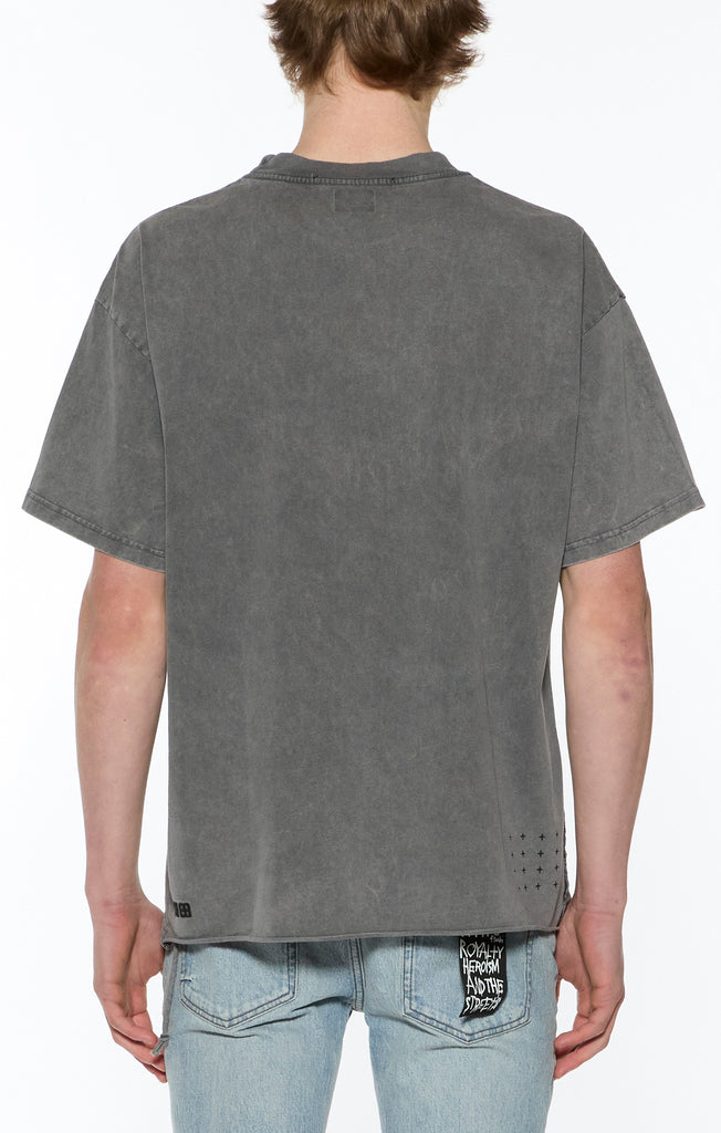 Boxy oversized fitting short sleeve t-shirt with a dropped shoulder and raw cut back hem. Detailed with a reversed overlocked side seam signature rats tail and branded logos. Made from a European heavy weight cotton jersey garment dyed Old Black. Featuring sign of the times logo printed partnered with seasonal scatter deconstruction on the front and back. Finished with t-box and 4x4 embroidery branding.
