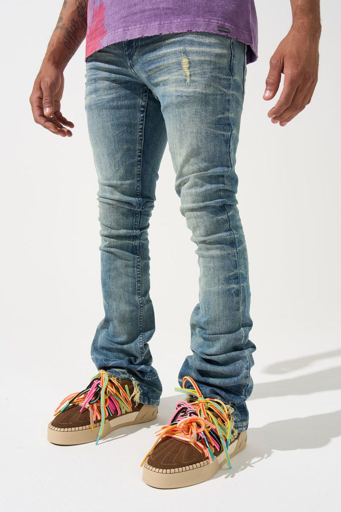 SERENEDE® NEPTUNE Stacked Jeans - Vintage mid-blue classic wash with whiskering fade. Stone wash finish, extended length. Signature fitted construction, stacked finish.