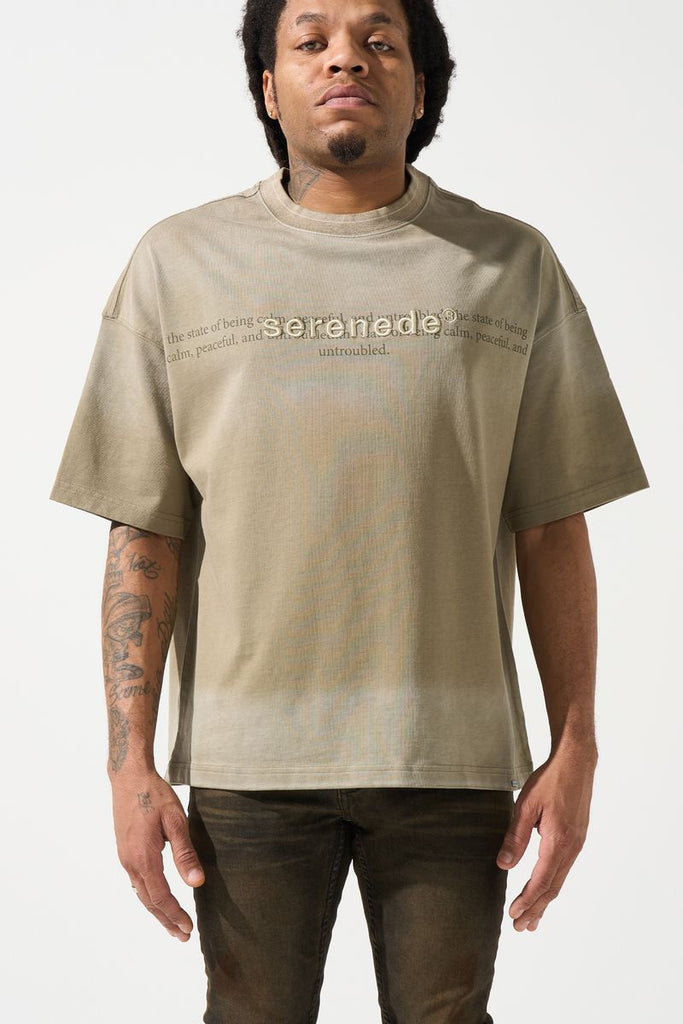 SERENEDE® SKYLETTER Fog T-Shirt - Light fog relaxed fit t-shirt featuring word print graphic with embroidered serenede®.